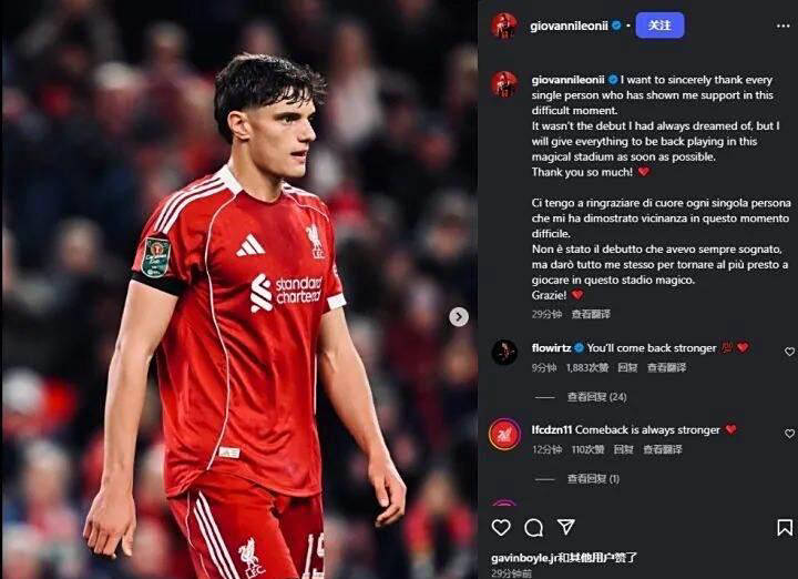莱奥尼在社交媒体上感谢支持者,并表示会全力以赴恢复健康。这段灾难性首秀让利物浦只剩下范迪克、乔-戈麦斯和科纳特三名健康中后卫,需要在冬季转会窗口寻找替补。